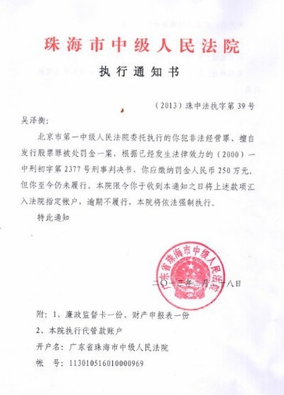 March 8th, 2013: Wu received a court document from the Zhuhai Middle Court, stating the it received an order from Beijing Middle Court asking Wu to pay a fine of 2.5 million Yuan within 10 days of receiving the Court Notice, or the Court will take legal action and force Wu to do so. In this document, the Court said this was based on a prior case against Wu dating back to the year 2000 in which Wu was charged and convicted of “Economic Crimes.”