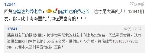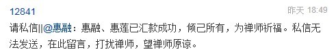12841: Thanks to the generosity of friends from many places, I have raised enough money to pay for the fine. As such, there is no need to send money to this account anymore,. Given that it only took three days to raise the money, I feel overwhelmed by your support and am immensely grateful. Although many who loaned me the money refused to tell me your name and addresses, please do so in order to me to repay the money to you in the future. Send me your information to by text message to the number 15018337790. Even if you do not wish to be repaid, I would like to be able to update you on the status of my case which I will report to you soon.