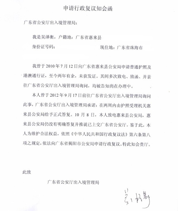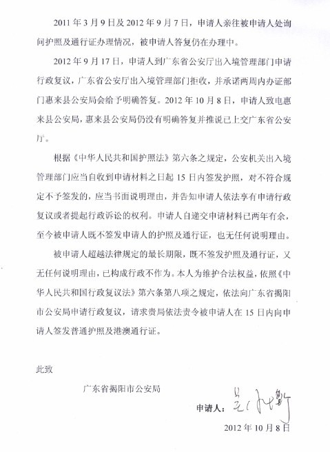 On October 19, 2012,Wu submitted an Application for the Administrative Reconsideration to the Jieyang Public Security Bureau of Guangdong Province according to the Article 6(8) of the Administrative Reconsideration Law of the People‘s Republic of China. The documentation for this is below.