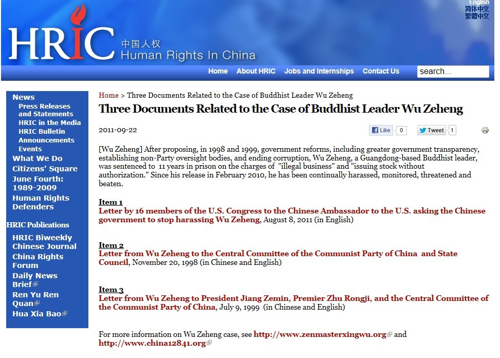 September 22, 2011, Human Rights in China * (HRIC) started to pay closer attention to Wu's case and his recent suffering.