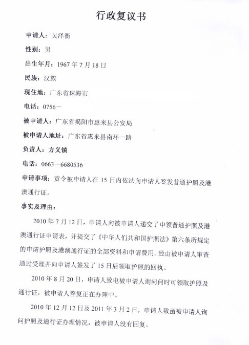 On October 19 2012, Wu submitted an Application for Administrative Reconsideration to the Jieyang Public Security Bureau of Guangdong Province according to the Article 6(8) of the Administrative Reconsideration Law of the People's Republic of China.